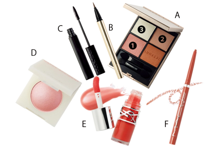 【A】の❶と❷を混ぜたモーヴピンクを、アイホールと下まぶたのキワに。涙袋には❸のパールをのせ、❷でほんのりと影をつけて。涙袋をしっかり強調するのが今年風。インラインは【B】のブラウン、まつ毛には【C】のマスカラを。