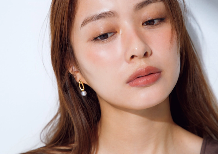 NOファンデ&パウダーで薄づきの生ツヤ肌に仕上げ、ブラウンチークの重たさを回避。ピンクを仕込むことで、血色感を補いながらくすみをカバーし明るい印象に。