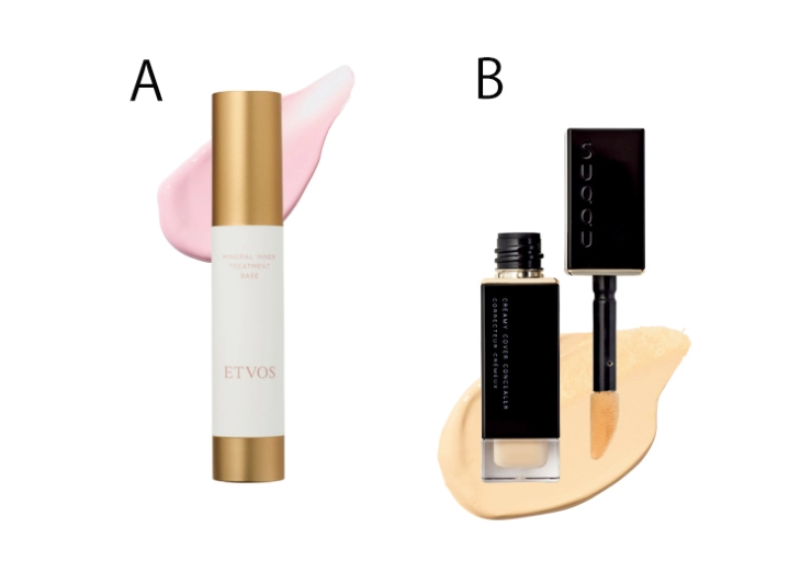 顔全体に【A】のピンク下地を塗り、気になる部分は 【B】でカバー。チークをのせる部分は【B】を塗らず薄づきに。パウダーはなしで生ツヤっぽく。