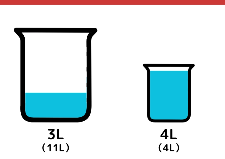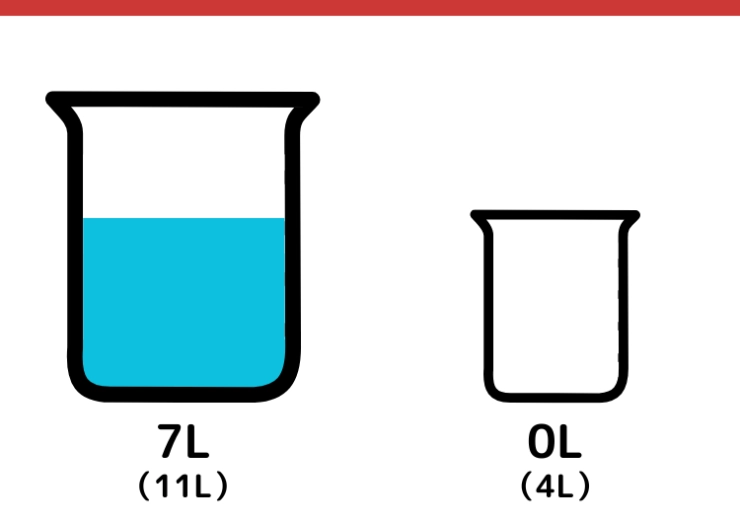 CULTURE 2025.01.18【クイズ】あの大企業も入社問題に採用している?「11Lと4Lの容器で10L」をはかるには?某一流企業の入社問題としても出題されている論理クイズを出題。一見簡単そうに見えるけど、実は意外と難しい!答えになかなか辿り着けなくても解説を読めばスッキリするかも!4Lの容器の水を捨てます。11Lの容器に入っていた7Lの水を4Lの容器に移します。そうすると、11Lの容器には3Lが残り、4Lの容器は満杯になります。1234