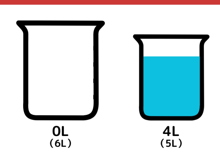 CULTURE 2025.02.02【クイズ】あの大企業も入社問題に採用している?「6Lと5Lの容器で3L」をはかるには?某一流企業の入社問題としても出題されている論理クイズを出題。一見簡単そうに見えるけど、実は意外と難しい!答えになかなか辿り着けなくても解説を読めばスッキリするかも!6L容器の水を捨てて殻にします。5L容器に入っている4Lの水を6L容器に移します。1234