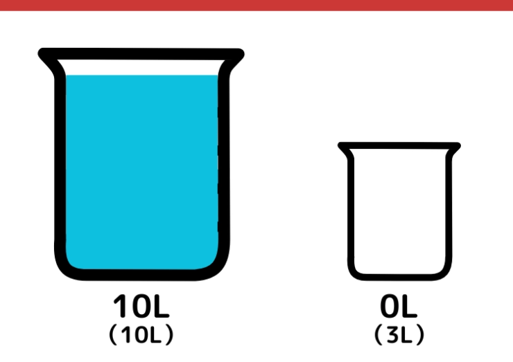 CULTURE 2025.02.10【クイズ】あの大企業も入社問題に採用している?「10Lと3Lの容器で1L」をはかるには?某一流企業の入社問題としても出題されている論理クイズを出題。一見簡単そうに見えるけど、実は意外と難しい!答えになかなか辿り着けなくても解説を読めばスッキリするかも!このクイズ正しく解ける?水がちょうど1L入る容器が手元にありません。10Lと3Lの容器を使って、ちょうど1Lの水を計る方法を考えてください。※今回ご紹介する回答は、解き方の1つです。他に回答を導き出す方法がある場合があります。※水が溢れることや残っていることは一旦無視します。イラストで答えを解説!まず、10Lの容器を満たします。1234