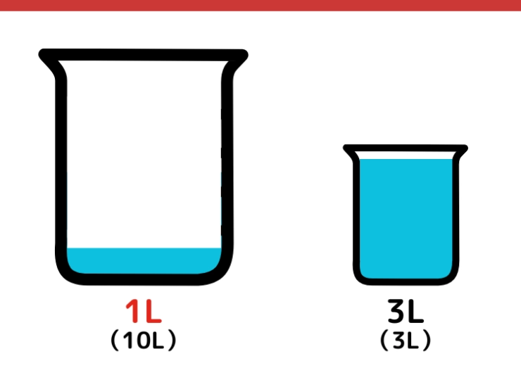 再度10L容器から3L容器に水を移します。10L容器には元々4Lの水があったので、3L容器に水が移ったことで10L容器にはちょうど1Lの水が残ります。