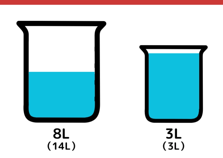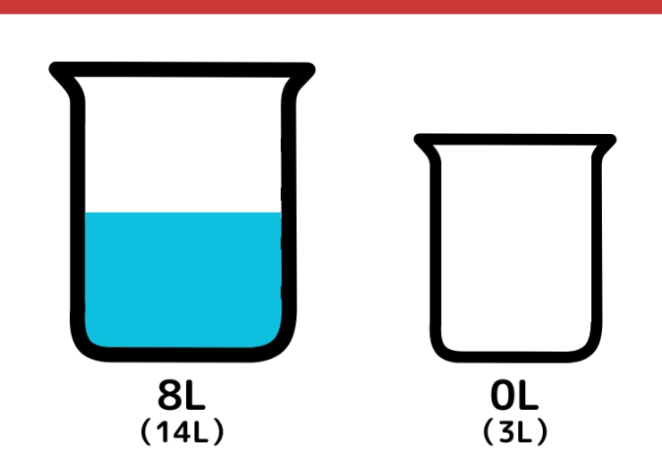 CULTURE 2025.02.13【クイズ】正解できたら一流企業に入社できるかも?「14Lと3Lの容器で5L」をはかるには?某一流企業の入社問題としても出題されている論理クイズを出題。一見簡単そうに見えるけど、実は意外と難しい!答えになかなか辿り着けなくても解説を読めばスッキリするかも!再び14L容器の水を3L容器に水を移します。再度3L容器の水を全て捨てて3L容器を殻にします。1234