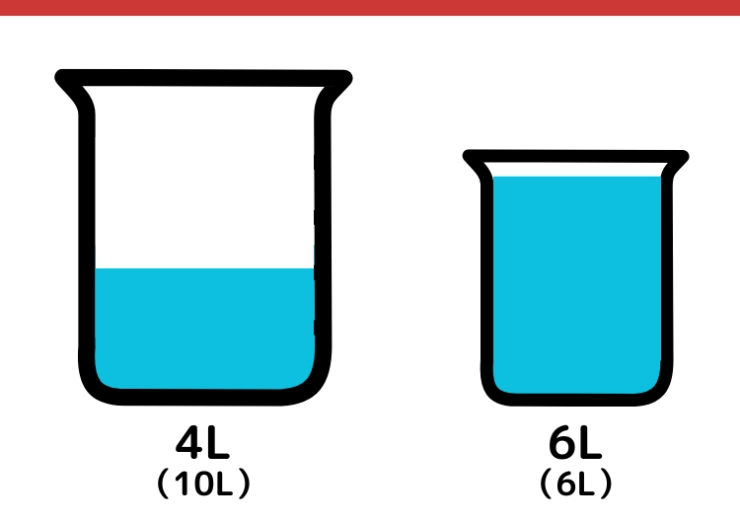 CULTURE 2025.02.14【クイズ】一流企業が入社問題にしている!?「10Lと6Lの容器で8L」をはかるには?某一流企業の入社問題としても出題されている論理クイズを出題。一見簡単そうに見えるけど、実は意外と難しい!答えになかなか辿り着けなくても解説を読めばスッキリするかも!このクイズ正しく解ける?水がちょうど8L入る容器が手元にありません。10Lと6Lの容器を使って、ちょうど8Lの水を計る方法を考えてください。※今回ご紹介する回答は、解き方の1つです。他に回答を導き出す方法がある場合があります。※水が溢れることや残っていることは一旦無視します。イラストで答えを解説!まず、10Lの容器を満たします。10L容器から6L容器に水を移します。1234