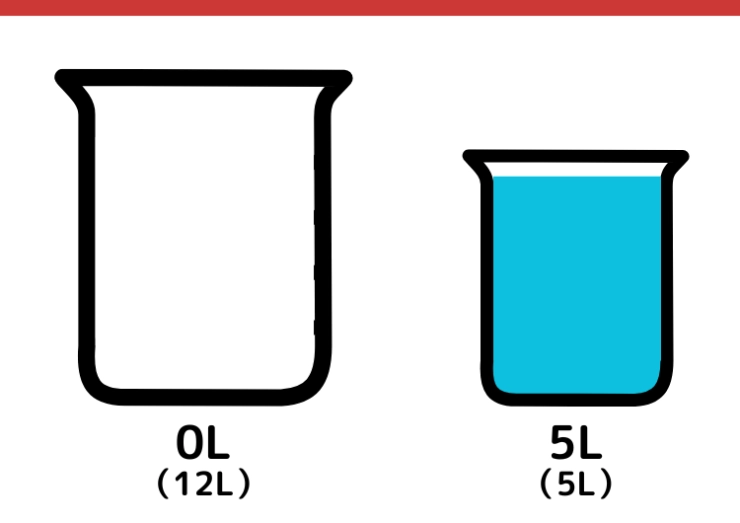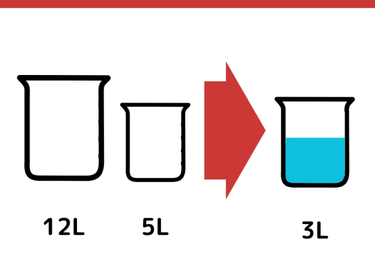 CULTURE 2025.02.16【クイズ】あの大企業も入社問題に採用している?「12Lと5Lの容器で3L」をはかるには?某一流企業の入社問題としても出題されている論理クイズを出題。一見簡単そうに見えるけど、実は意外と難しい!答えになかなか辿り着けなくても解説を読めばスッキリするかも!このクイズ正しく解ける?水がちょうど3L入る容器が手元にありません。12Lと5Lの容器を使って、ちょうど3Lの水を計る方法を考えてください。※今回ご紹介する回答は、解き方の1つです。他に回答を導き出す方法がある場合があります。※水が溢れることや残っていることは一旦無視します。イラストで答えを解説!まず、5Lの容器を満たします。1234