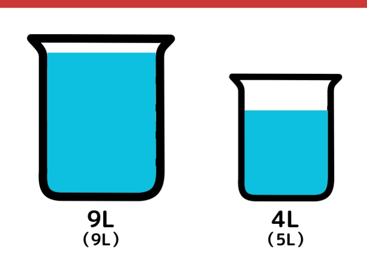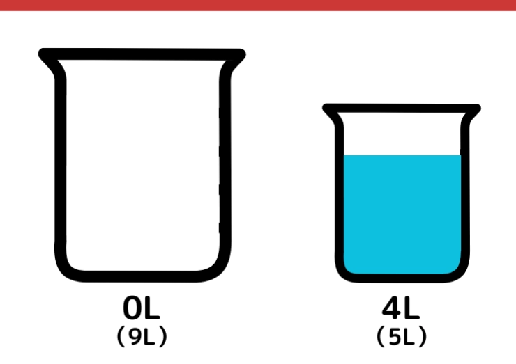CULTURE 2025.02.20【クイズ】正解できたら一流企業に入社できるかも?「9Lと5Lの容器で8L」をはかるには?某一流企業の入社問題としても出題されている論理クイズを出題。一見簡単そうに見えるけど、実は意外と難しい!答えになかなか辿り着けなくても解説を読めばスッキリするかも!9L容器に入っていた4Lの水を5L容器に移します。再度9L容器を水で満杯にします。1234