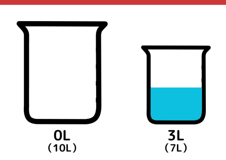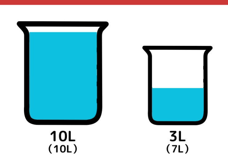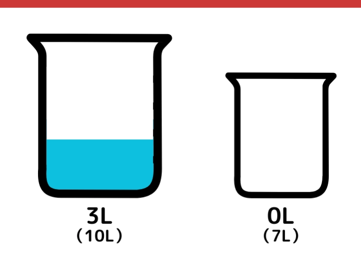 CULTURE 2025.02.22【クイズ】あの有名企業も入社問題にしている!?「10Lと7Lの容器で9L」をはかるには?某一流企業の入社問題としても出題されている論理クイズを出題。一見簡単そうに見えるけど、実は意外と難しい!答えになかなか辿り着けなくても解説を読めばスッキリするかも!7L容器に入っている水を全て捨てて空にします。10L容器に入っている3Lの水を7L容器に移します。再び10L容器を水でいっぱいにします。1234