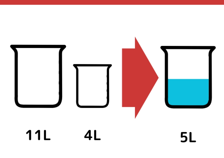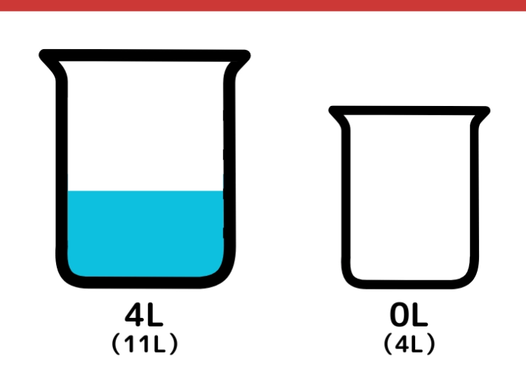 CULTURE 2025.02.23【クイズ】有名企業の入社問題にチャレンジ!?「11Lと4Lの容器で5L」をはかるには?某一流企業の入社問題としても出題されている論理クイズを出題。一見簡単そうに見えるけど、実は意外と難しい!答えになかなか辿り着けなくても解説を読めばスッキリするかも!このクイズ正しく解ける?水がちょうど5L入る容器が手元にありません。11Lと4Lの容器を使って、ちょうど5Lの水を計る方法を考えてください。※今回ご紹介する回答は、解き方の1つです。他に回答を導き出す方法がある場合があります。※水が溢れることや残っていることは一旦無視します。イラストで答えを解説!まず、4Lの容器を満たします。4L容器から11L容器に水を移します。1234
