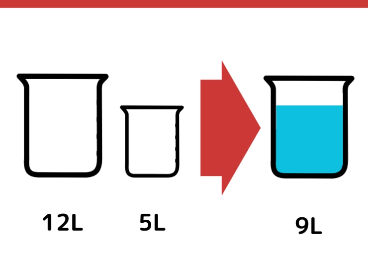 CULTURE 2025.02.24【クイズ】正解できたら一流企業に入社できるかも?「12Lと5Lの容器で9L」をはかるには?某一流企業の入社問題としても出題されている論理クイズを出題。一見簡単そうに見えるけど、実は意外と難しい!答えになかなか辿り着けなくても解説を読めばスッキリするかも!このクイズ正しく解ける?水がちょうど9L入る容器が手元にありません。12Lと5Lの容器を使って、ちょうど9Lの水を計る方法を考えてください。※今回ご紹介する回答は、解き方の1つです。他に回答を導き出す方法がある場合があります。※水が溢れることや残っていることは一旦無視します。イラストで答えを解説!まず、12Lの容器を満たします。12L容器から5L容器に水を移します。1234