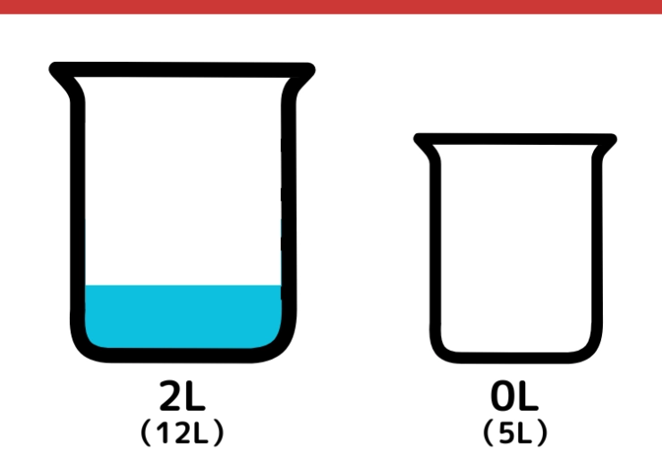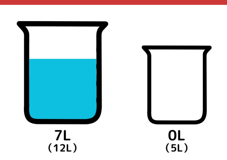 CULTURE 2025.02.24【クイズ】正解できたら一流企業に入社できるかも?「12Lと5Lの容器で9L」をはかるには?某一流企業の入社問題としても出題されている論理クイズを出題。一見簡単そうに見えるけど、実は意外と難しい!答えになかなか辿り着けなくても解説を読めばスッキリするかも!5L容器の水を全て捨てて空にします。再度12L容器から5L容器に水を移します。再度5L容器に入っている水を全て捨てて空にします。1234