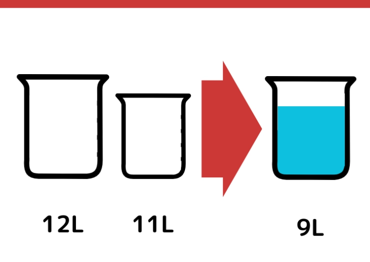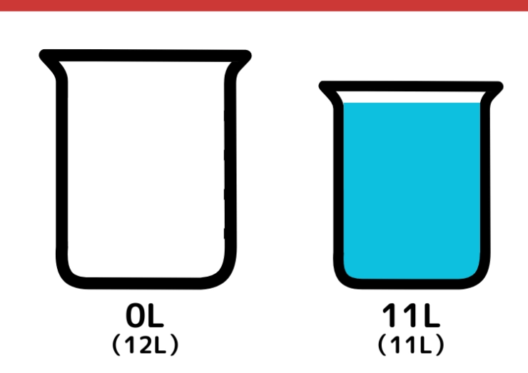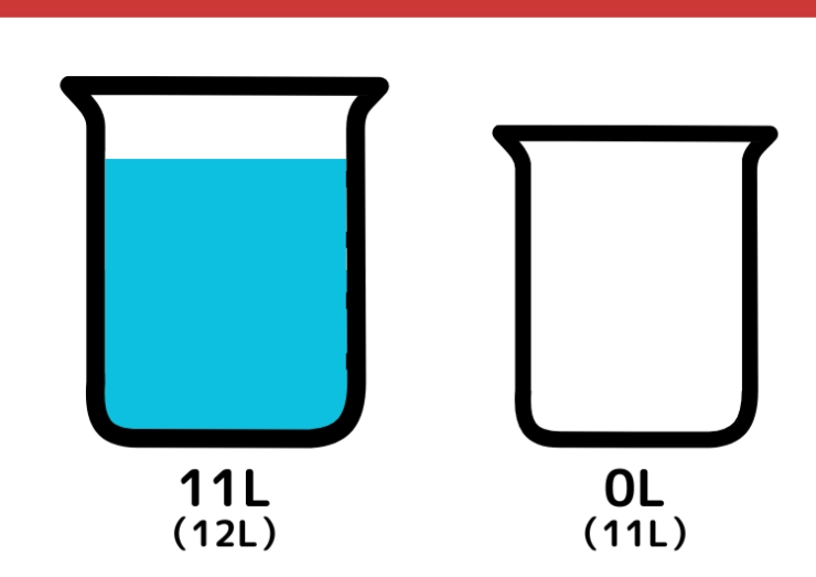 CULTURE 2025.02.25【クイズ】あの大企業も入社問題に採用している?「12Lと11Lの容器で9L」をはかるには?某一流企業の入社問題としても出題されている論理クイズを出題。一見簡単そうに見えるけど、実は意外と難しい!答えになかなか辿り着けなくても解説を読めばスッキリするかも!このクイズ正しく解ける?水がちょうど9L入る容器が手元にありません。12Lと11Lの容器を使って、ちょうど9Lの水を計る方法を考えてください。※今回ご紹介する回答は、解き方の1つです。他に回答を導き出す方法がある場合があります。※水が溢れることや残っていることは一旦無視します。イラストで答えを解説!まず、11Lの容器を満たします。11L容器から12L容器に水を移します。1234