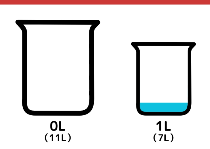 CULTURE 2025.03.04【クイズ】有名企業の入社問題にチャレンジ!?「11Lと7Lの容器で5L」をはかるには?某一流企業の入社問題としても出題されている論理クイズを出題。一見簡単そうに見えるけど、実は意外と難しい!答えになかなか辿り着けなくても解説を読めばスッキリするかも!7L容器に入っていた水を全て捨てます。11L容器に入っていた1Lの水を7L容器に移します。123456