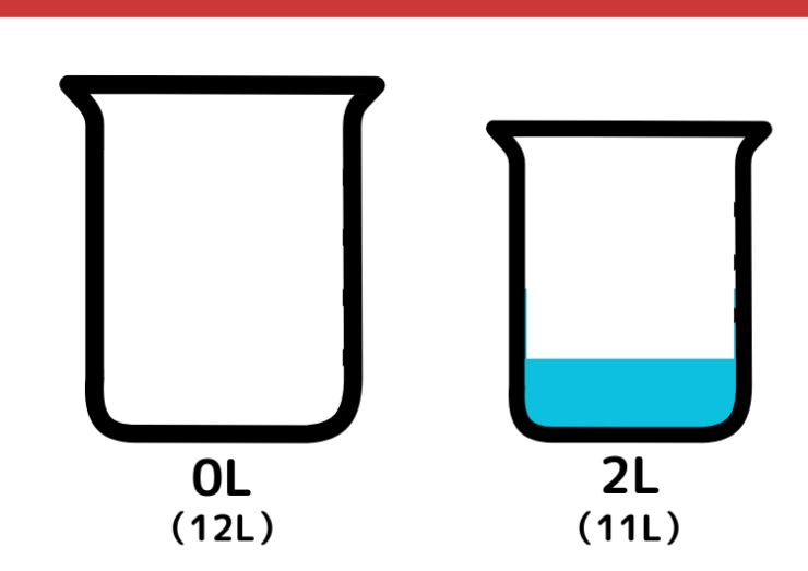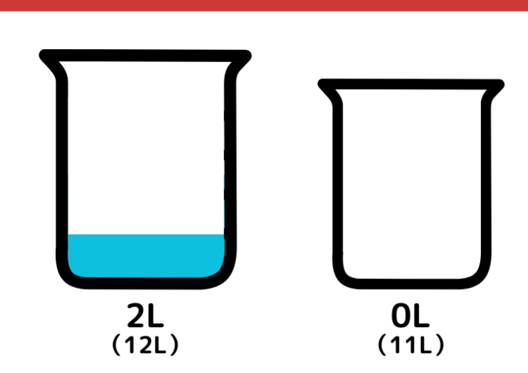 CULTURE 2025.03.05【クイズ】正解できたら一流企業に入社できるかも?「12Lと11Lの容器で3L」をはかるには?某一流企業の入社問題としても出題されている論理クイズを出題。一見簡単そうに見えるけど、実は意外と難しい!答えになかなか辿り着けなくても解説を読めばスッキリするかも!11L容器の水を全て捨てて空にします。再度12L容器から11L容器に水を移します。12345