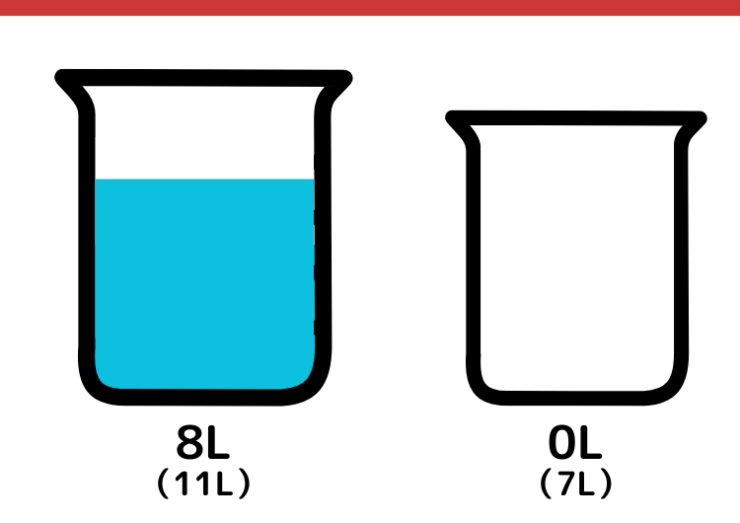 CULTURE 2025.03.06【クイズ】有名企業の入社問題にチャレンジ!?「11Lと7Lの容器で5L」をはかるには?某一流企業の入社問題としても出題されている論理クイズを出題。一見簡単そうに見えるけど、実は意外と難しい!答えになかなか辿り着けなくても解説を読めばスッキリするかも!7L容器に入っている水を全て捨てます。11L容器から7L容器に水を移します。123456