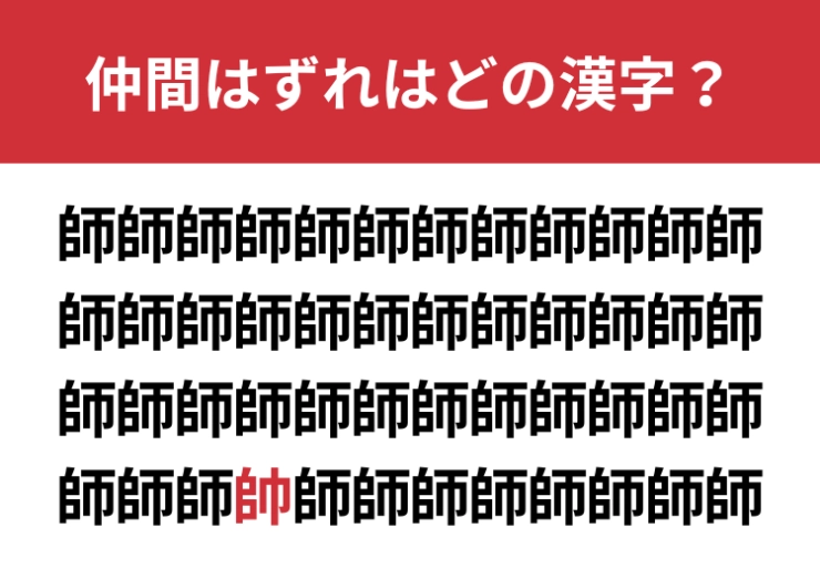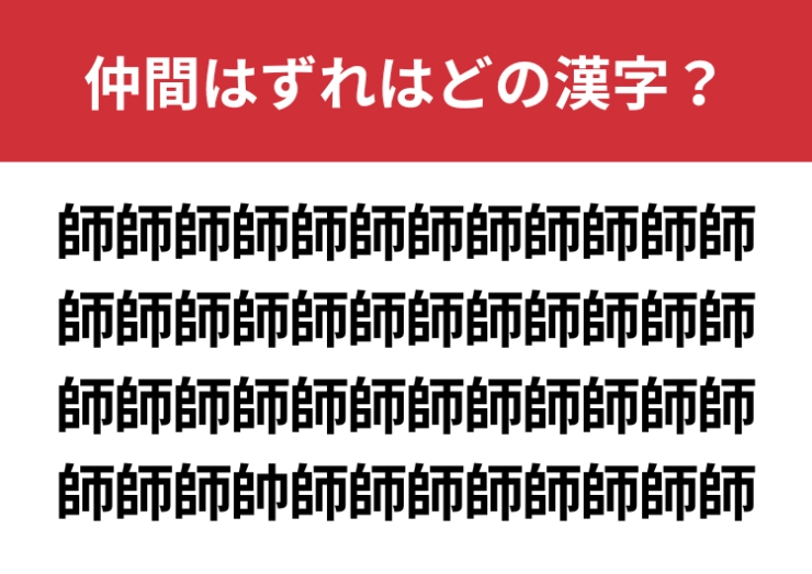 CULTURE 2025.09.18【漢字間違い探し】「師」の中に混ざった漢字は何?毎日忙しくて頭が疲れている・・・という人も多いはず。そんなときは脳トレクイズで楽しく頭をリフレッシュしましょう!並んだ漢字の中から、一つだけ違う漢字を集中して探してみて!仲間はずれはどの漢字?「師」という漢字の中に一つだけ異なる漢字が混ざっています。ヒントは、横棒に注目!正解を知りたい人は、もう少しスクロールしてみて!正解は・・・?正解は「帥(すい)」でした!「師」から横線を一本抜いたこの漢字。「統帥」など、指揮官を意味して使われます。あなたはわかりましたか?脳トレクイズにチャレンジして、疲れた頭をリフレッシュしましょう♪文/andGIRLweb編集部