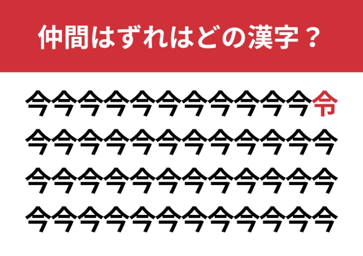 CULTURE 2025.09.20【漢字間違い探し】「今」の中に混ざった漢字は何?毎日忙しくて頭が疲れている・・・という人も多いはず。そんなときは脳トレクイズで楽しく頭をリフレッシュしましょう!並んだ漢字の中から、一つだけ違う漢字を集中して探してみて!仲間はずれはどの漢字?「今」という漢字の中に一つだけ異なる漢字が混ざっています。ヒントは、線の長さに注目!正解を知りたい人は、もう少しスクロールしてみて!正解は・・・?正解は「令(れい)」でした!元号の「令和」にも使われているこの漢字。書く際には「令」の他にも、下の部分を「マ」のようにする書き方がありますが、どちらも正しい漢字として認められているんだそう。あなたはわかりましたか?脳トレクイズにチャレンジして、疲れた頭をリフレッシュしましょう♪文/andGIRLweb編集部