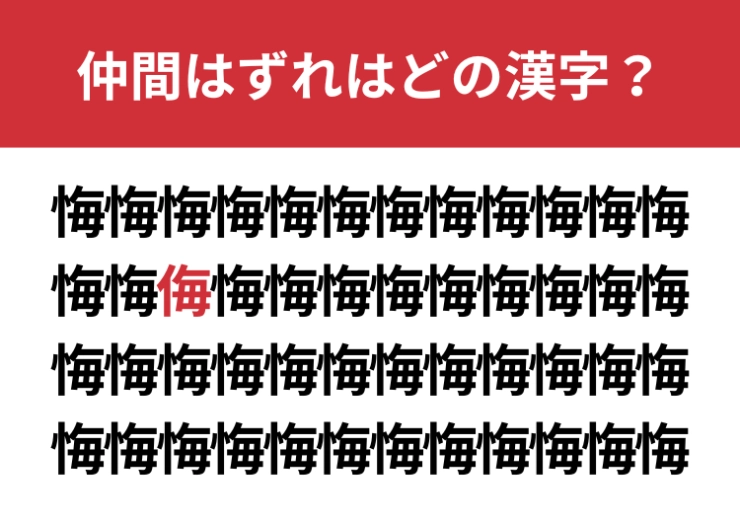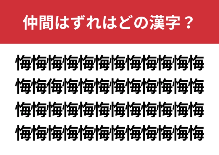 【漢字間違い探し】「悔」の中に混ざった漢字は何?