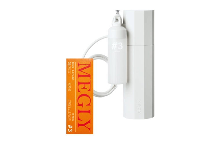高濃度炭酸と一緒に化粧水を吹きかけることで、肌の血流を促進。全5種類ある専用化粧水のうち#3は、角質&毛穴ケアができる導入化粧水に◎。MEGLYスターターキット(デバイス、専用化粧水1本、カートリッジ1本)¥30,000円/MTG