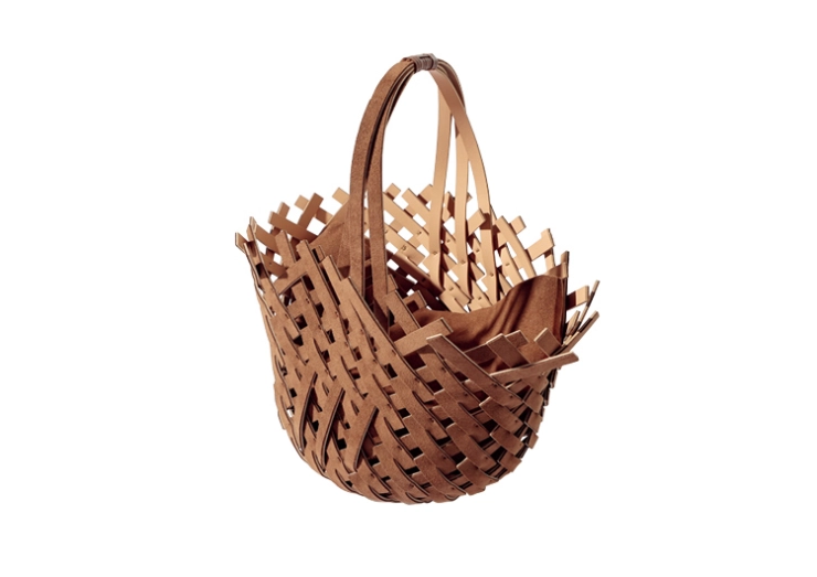 まるでパズルのようにスエードでかごを表現