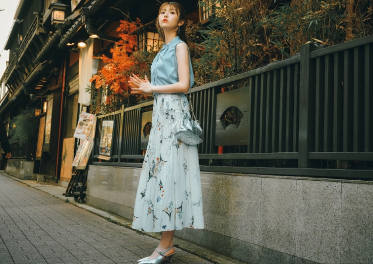 花柄スカート¥24,200、ブラウス¥17,600/ともにFRAY I.D ルミネ新宿2店 シルバーバッグ¥5,390/カシュカシュ(アンビリオン) シルバーパンプス¥18,700/Stola. シルバーピアス¥14,300/サローネ サーティ(フォーティーン ショールーム)