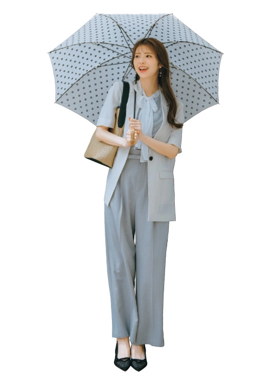 白ジャケット¥15,400/ココ ディール ボウタイトップス¥11,880/CELFORD ルミネ新宿2店 ベルト付きパンツ¥5,489/ロペピクニック(ジュン) カゴバッグ¥8,690/カシュカシュ(アンビリオン) メッシュパンプス¥47,300/ファビオ ルスコーニ(エリオポール代官山) 晴雨兼用傘¥14,300/トラディショナル ウェザーウェア(トラディショナル ウェザーウェア ルミネ有楽町店) パールピアス¥12,980/yuma(ロードス)