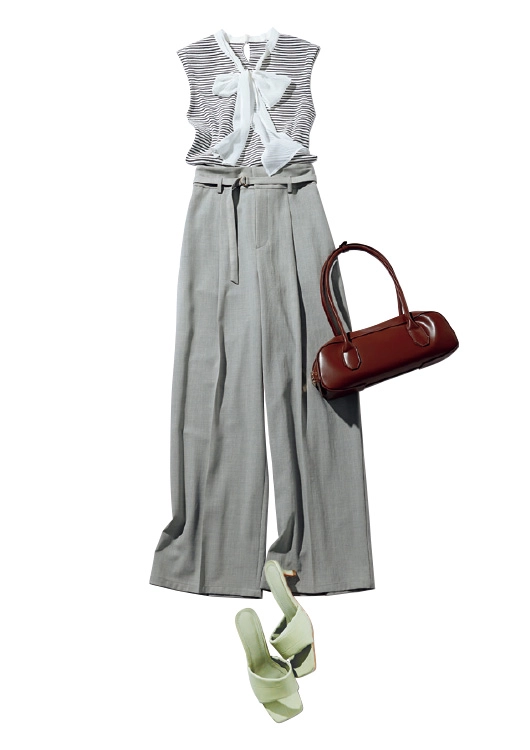 ボウタイトップス¥11,880/CELFORD ルミネ新宿2店 ベルト付きパンツ¥5,489/ロペピクニック(ジュン) 横長バッグ¥9,350/カカトゥ(アンビリオン) グリーンサンダル¥5,200/Olu.
