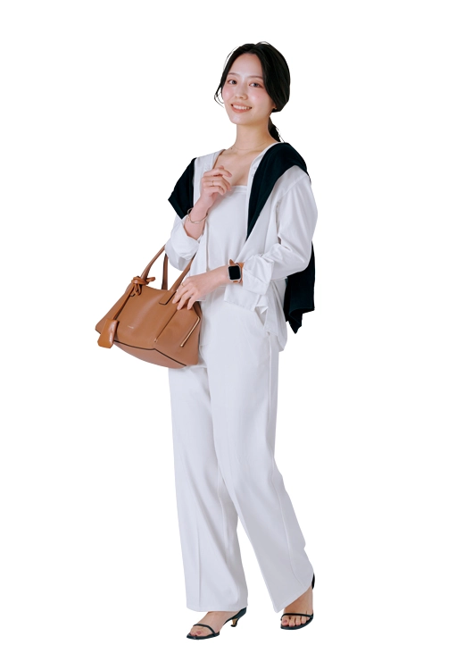 「上がピタッとしているので、フレアなボリュームのあるボトムを合わせてメリハリ感をプラス。ボトムはリネン素材で涼しく、夏から秋まで長く使えてお気に入りです。また、秋らしさを出すために、バッグはブラウンを合わせました」(商社勤務/立川怜那さん・31歳)