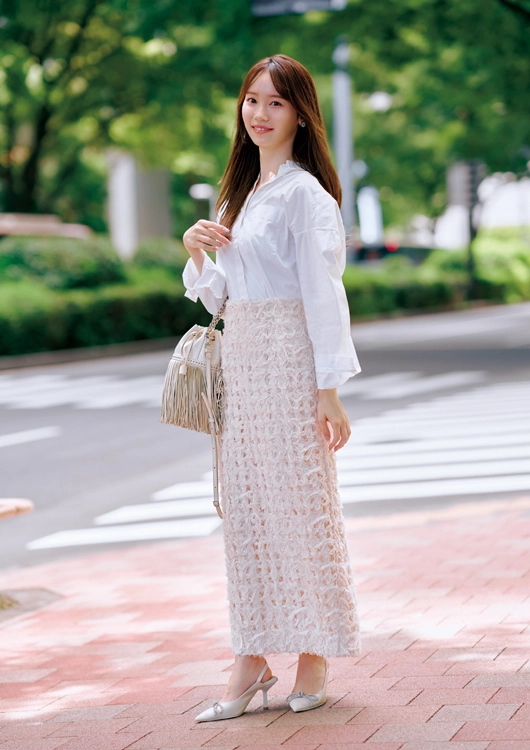 「胸元のポケットと何にでも合うきれいめな形が魅力のリクルートすぎない白シャツ。コーデに統一感を出すためにボトムも同系色で合わせました。シャギー素材が秋らしいアニュアンスのスカートは、ハイウエストなのでスタイルアップも狙えます」(法律事務所勤務/川原千里さん・25歳)