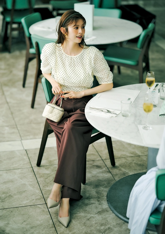 ほんのり透けるシアーやドット柄がガーリーなブラウスは、ブラウンカラーが上品なパンツを合わせてクラシカルに仕上げて。