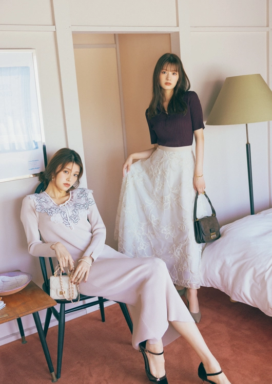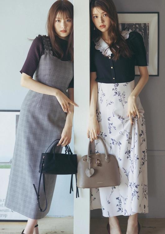 左・ ワンピース¥12,991/PROPORTION BODY DRESSING ニット¥12,100/ストロベリーフィールズ(シュガー・マトリックス) バッグ¥50,600/メアリオルターナ(AL Design Inc.) パンプス¥10,890/RANDA