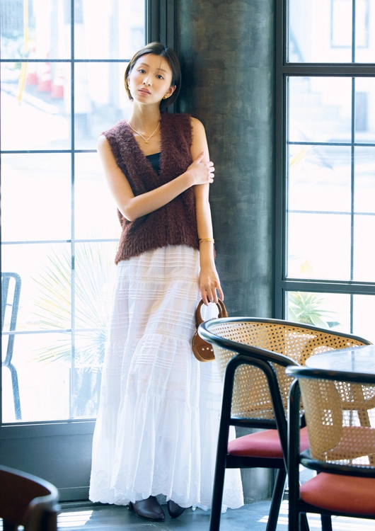 ベスト¥5,940/CITEN(ユナイテッドアローズ) 中に着たキャミソール¥6,930/AKTE スカート¥36,300/カデュネ イヤリング¥2,640/アネモネ(サンポークリエイト) パールネックレス¥20,900/チビ・ジュエルズ(チビジュエルズ・ジャパン) チェーンネックレス¥30,800/フェルセラ(ズットホリック) バングル¥24,200/Jouete バッグ¥12,900/CHARLES & KEITH JAPAN ブーツ¥24,200/レメ(セムインターナショナル)