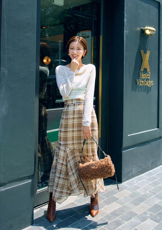 トラッドなチェックで脱・夏!シアーなマーメイドスカート&透け素材のギャザートップスでレディな趣きで一気に秋めく装いに。