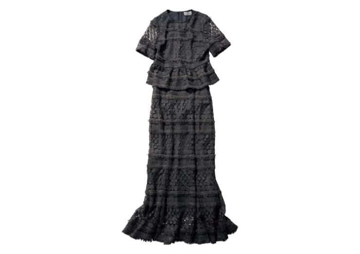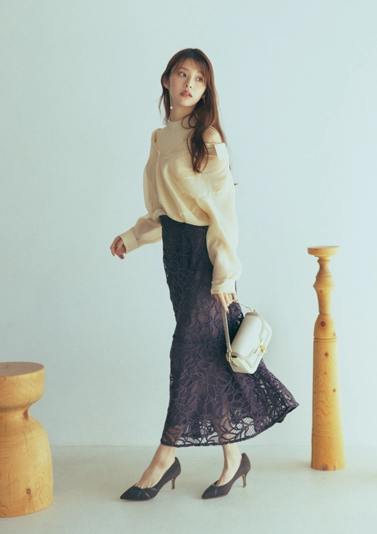 シルエットが女っぽいマーメイドスカートは、糖分過多になりすぎないようにシックな色みをチョイス。裾に向かって広がるボリュームにレースの透け感が加わって、エレガントな余韻を残します。透けシャツを合わせれば、秋にぴったりな装いに。