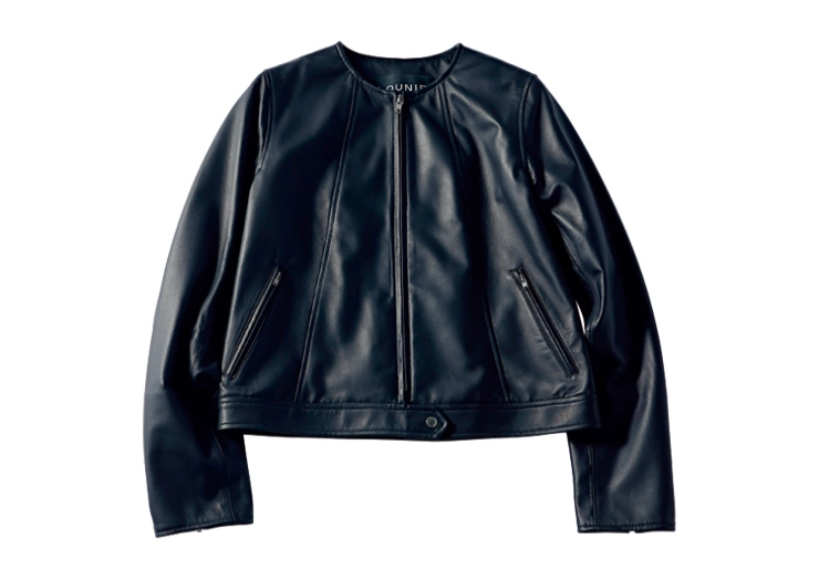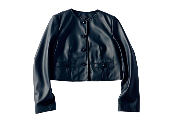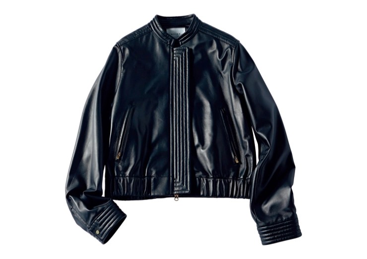 肌に吸い付くようななめらかな革の質感が、フェティッシュなムードを誘い裏ヒットの予感。短丈のコンパクトなシルエット、カラーは黒を選ぶと甘服とも好相性。