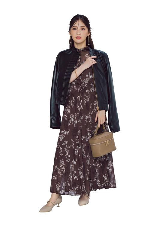 ハードなレザーの魅力で、花柄ワンピにおしゃれの伸びしろをプラス。