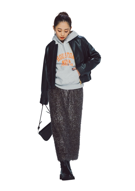 ジャケット/着回し パーカ¥12,980/チャンピオン(ヘインズブランズ ジャパン) スカート¥24,200/ルーニィ ピアス¥4,180/ヘンカ(ロードス) バッグ¥5,400/Olu. ブーツ¥32,890/STACCATO(バロックジャパ ンリミテッド)