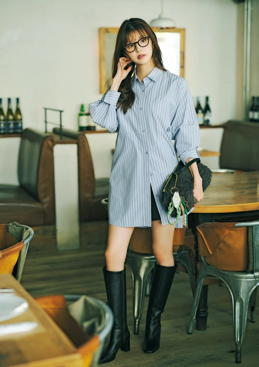 伊達メガネやロングブーツ、じゃらづけチャームなど、シンプルなシャツコーデには小物で遊び心を♪