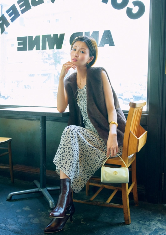 ジレ¥23,100/マイストラーダ ワンピース[カーディガン付き]¥21,450/LILY BROWN(LILY BROWN ルミネエスト新宿店) ピアス¥20,460/ソコ、バングル¥39,600/エムシー・スタジオ(ともにズットホリック) ネックレス¥7,700/チビ・ジュエルズ (チビジュエルズ・ジャパン) バッグ¥11,330/minitmute(ハナ ショールーム) ブーツ¥31,900/ダイアナ(ダイアナ 銀座本店)