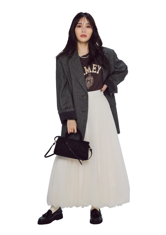 ジャケット/着回し Tシャツ¥9,350/AMERICANA(ドレステリア 渋谷スクランブルスクエア店) バルーンスカート¥20,900/CELFORD ルミネ新宿2店 ネックレス¥16,500/ココシュニック オンキッチュ(ココシュニック) バッグ¥50,600/メアリ オル ターナ(AL Design Inc.) 靴下 ¥1,100/靴下屋(タビオ) ローファー¥8,400/カステラーノ(フラッパーズ)