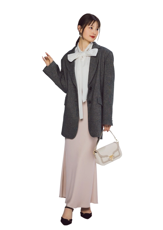 ジャケット/着回し ボウ タイブラウス¥17,600/アルペ ージュストーリー スカート¥17,600/アニュアンス イヤリン グ¥4,100/myu...(ロードス) バッグ¥14,300/ダイアナ(ダイ アナ 銀座本店) パンプス¥10,8 90/RANDA