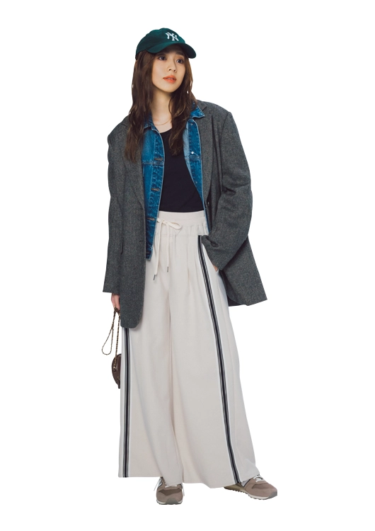 ジャケット/着回し デニムジャケット¥20,900/マイストラーダ タンクトップ¥4,950/CITEN(ユナイテッドアローズ) パンツ¥19,800/And Couture(AndCouture ルミネ新宿店) キャップ¥4,620/ニューエラ ネックレス¥2,640/アプロ(ロードス) バッグ¥2,590/神戸レタス スニーカー ¥12,980/ニューバランス(ニューバランスジ ャパン)