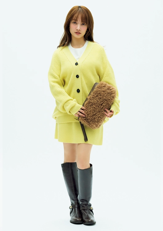 カーディガン ¥64,460、スカート¥37,180/ともにテラ(ティースクエア) Tシャツ¥7,920/ドレステリア(ドレステリア 渋谷スクランブルスクエア店) ピアス¥17,600/エムシー・スタジオ、ネックレス¥22,000/ジゼルベー(ともにズットホリック) バッグ¥35,200/オルセット(アンタイトル) ブーツ¥39,600/ダイアナ(ダイアナ 銀座本店)