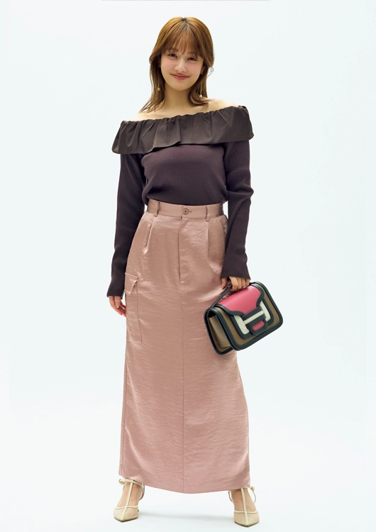 ジュエリー以外でピンクゴールドを取り入れるなら、サテン素材がおすすめ!カーゴ風ポケットがほどよく甘辛で、抜け感も満点です。