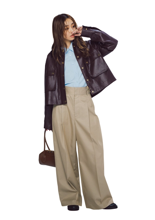 ブルゾン/着回し シャツ¥12,650/JILL byJILL STUART チノパン¥25,300/アンクレイヴ(オンワード樫山) ネックレス¥22,050/アビステ バッグ¥9,350/カカトゥ(アンビリオン) ローファー¥19,800/ダニエラアンドジェマ