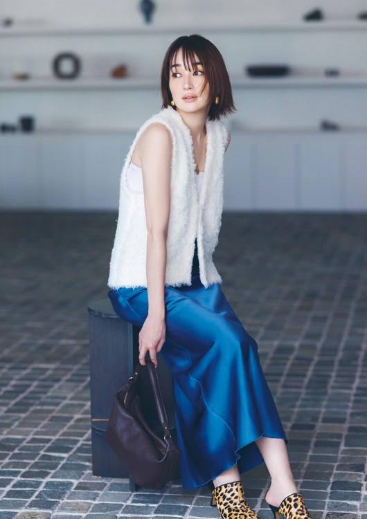 ウォーミーなベストは、サテンスカートにゆったり合わせて肩肘張らずに女らしく。