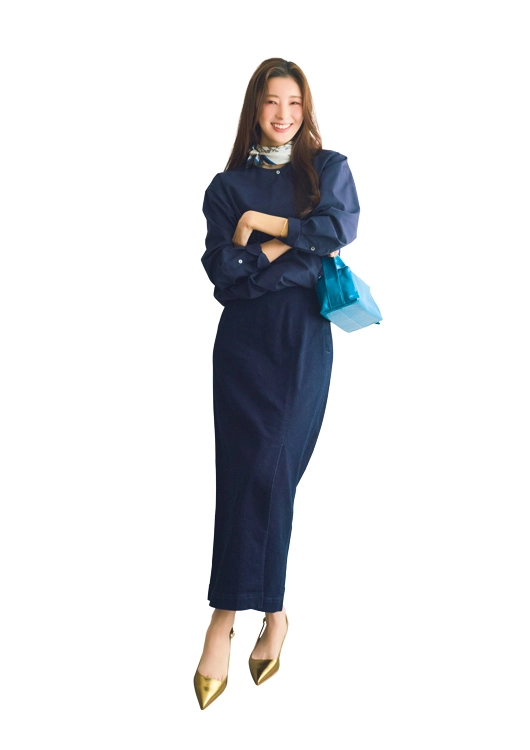 デニムスカートのラフさが、肩肘張らない美人なオーラを演出。カシュクールブラウスを合わせてもコンサバになりすぎず、しゃれ感たっぷりに。