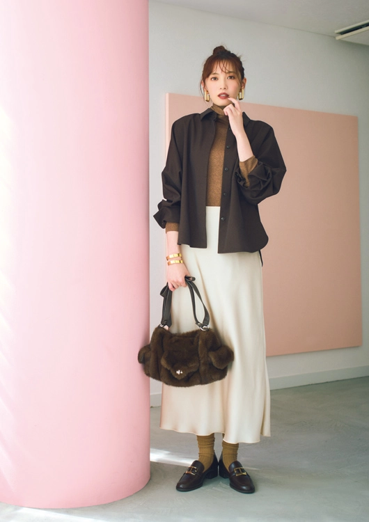 全体にバランスよくダークブラウンを効かせることでリズムが生まれてコーデの完成度がUP。サテンスカートやファーバッグなど、表情豊かな素材も素敵な立体感を作るコツ。