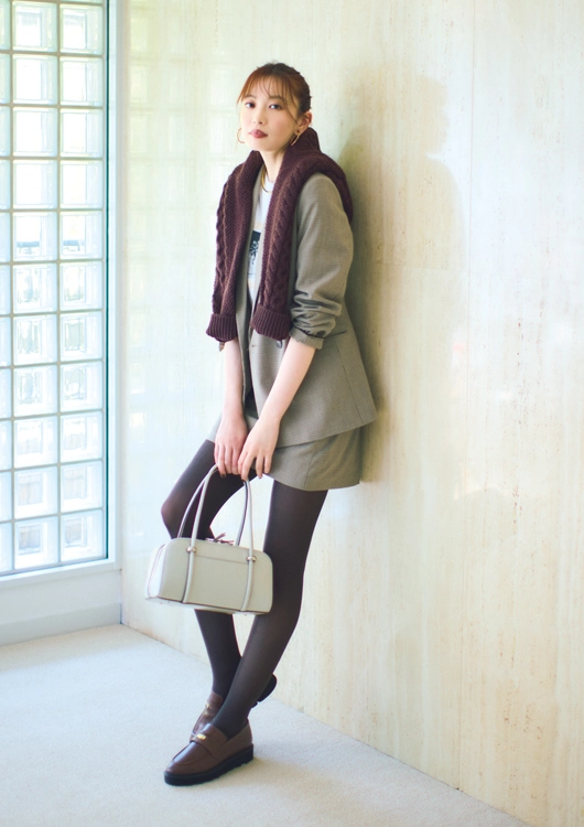 ジャケット¥6,990、スカート¥2,990/ともにUNIQLO Tシャツ¥3,990/アンフィーロ(オンワード樫山) 肩にかけたニット¥2,990/GU イヤリング¥12,960/アビステ チョーカー¥7,700/mimi33(サンポークリエイト) バッグ¥14,300/アルテミス by ダイアナ(アルテミス by ダイアナ アーバンドック ららぽーと豊洲店) コインローファー¥19,800/銀座かねまつ(銀座かねまつ 6丁目本店)タイツ/スタイリスト私物