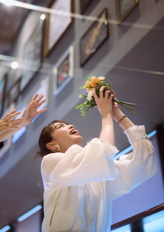 12月31日にカウントダウンパーティーの開催が決定している「Brew33 Bar」では、結婚式二次会でブーケキャッチ!のカットを撮影しました。謎の手は撮影スタッフのもの(汗)。